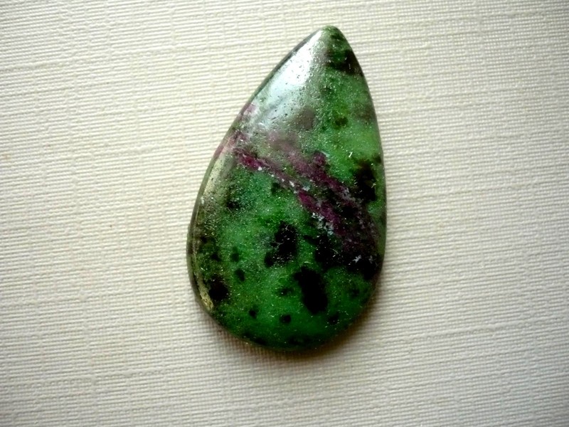 Kabošon rubínu v zoisitu, top kvalita. Rozměry 32 x 19 x 5 mm. Vhodné pro cínování, obšívání... Ze spodní strany je plochý. Cena za tento konkrétní kus. Původ Afrika.
