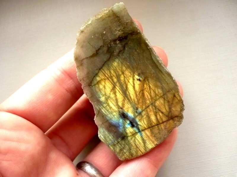 Labradoritový půlbrus, rozměry 61 x 40 x 25 mm. Jde o surovinu, broušenou a vyleštěnou z jedné strany. Vhodné do sbírek, jako dekorace, či k další tvorbě.