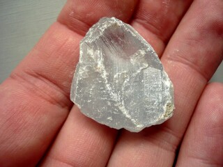 Krystal - celestýn. Původ Madagaskar. Rozměry 32 x 25 x 16 mm. Tento minerál se velmi špatně opracovává a je velmi vzácný. Má modrošedou kouřovou barvu. Celestýn - používá se na zklidnění mysli a krotí arogantní a tvrdé povahy.