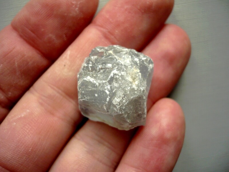 Krystal - celestýn. Původ Madagaskar. Rozměry 22 x 22 x 18 mm. Tento minerál se velmi špatně opracovává a je velmi vzácný. Má modrošedou kouřovou barvu.