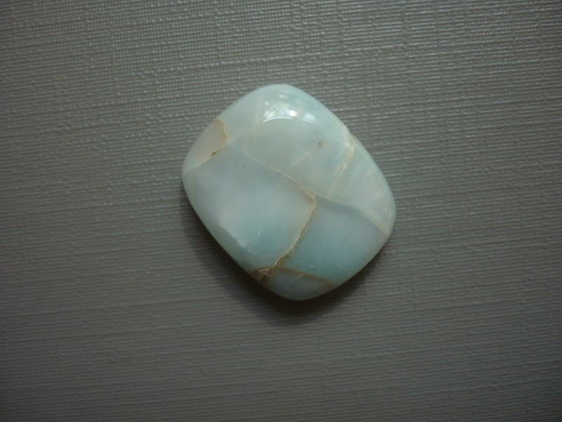 Kabošon - larimar. Rozměry 21 x 17 x 6 mm. Naleziště Dominikánská republika. Patří do skupiny pektolitů, mají krásné modré zbarvení připomínající moře. Larimar - název odvozen od slova "Mare" - moře a začátku jména Larissa, dcery obejvitele Mendeze.