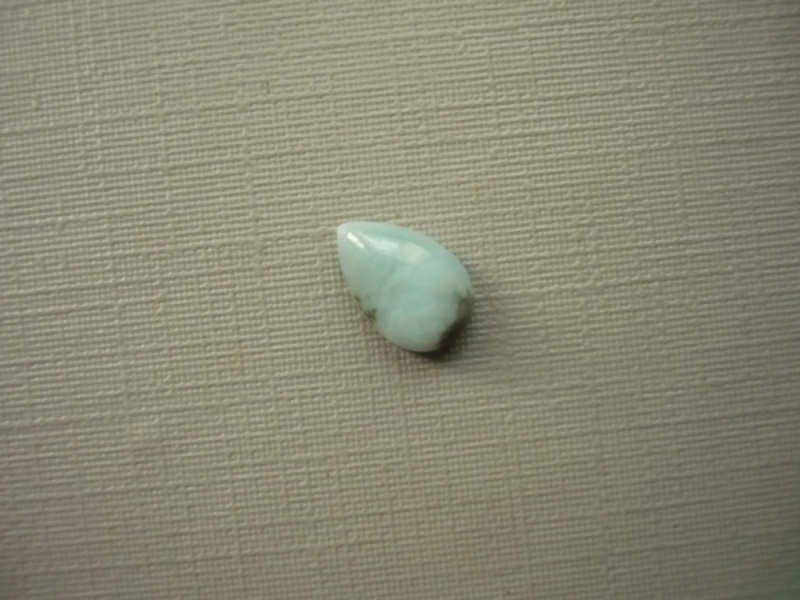 Kabošon - larimar. Rozměry 9 x 6 x 3 mm. Naleziště Dominikánská republika. Patří do skupiny pektolitů, mají krásné modré zbarvení připomínající moře. Larimar - název odvozen od slova "Mare" - moře a začátku jména Larissa, dcery obejvitele Mendeze.