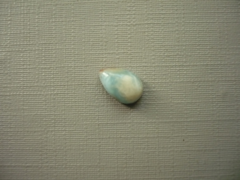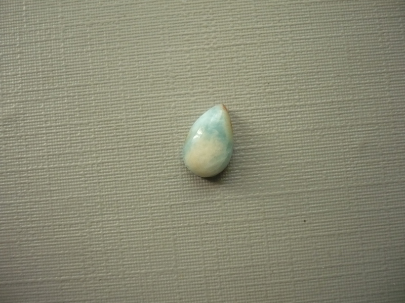 Kabošon - larimar. Rozměry 9 x 6 x 3 mm. Naleziště Dominikánská republika. Patří do skupiny pektolitů, mají krásné modré zbarvení připomínající moře. Larimar - název odvozen od slova "Mare" - moře a začátku jména Larissa, dcery obejvitele Mendeze.