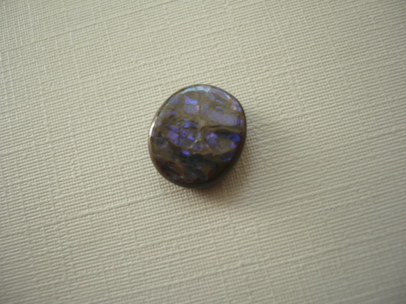 Nevrtaný tvar - kabošon ammolitu. Rozměry 11 x 10 x 4 mm. Je to velmi vzácný kousek, duhová vrstva aragonitu. Jde o malé kousky amonitových schránek, které hrají všemi duhovými barvami. Jsou na břidlicové podložce, chráněno je vrstvou křišťálu, lastury jsou jinak velice křehké. Původ Kanada.