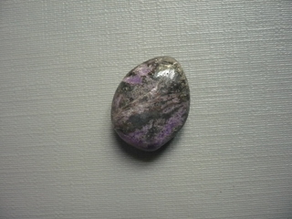 Tromlovaný kámen - sugilit (luvulit). Rozměry 17 x 13 x 6 mm. Původ JAR. Sugilit - byl objeven v jihozápadním Japonsku v roce 1944 profesorem Ken-ichi Sugi, po kterém je pojmenován. V roce 1979 bylo náhodně objeveno velké množství sugilitu drahokamové kvality v manganových dolech v okolí Kurumanu v Jižní Africe, odkud jsouni tyto tromláčky. Sugilit je oblíben zejména pro svoji krásnou fialovou nebo purpurovou barvu a ceněný je pro svoji unikátnost a omezené zdroje.