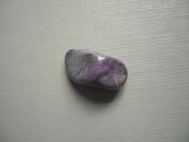 Tromlovaný kámen - sugilit (luvulit). Rozměry 19 x 10 x 10 mm. Původ JAR. Sugilit - byl objeven v jihozápadním Japonsku v roce 1944 profesorem Ken-ichi Sugi, po kterém je pojmenován. V roce 1979 bylo náhodně objeveno velké množství sugilitu drahokamové kvality v manganových dolech v okolí Kurumanu v Jižní Africe, odkud jsouni tyto tromláčky. Sugilit je oblíben zejména pro svoji krásnou fialovou nebo purpurovou barvu a ceněný je pro svoji unikátnost a omezené zdroje.