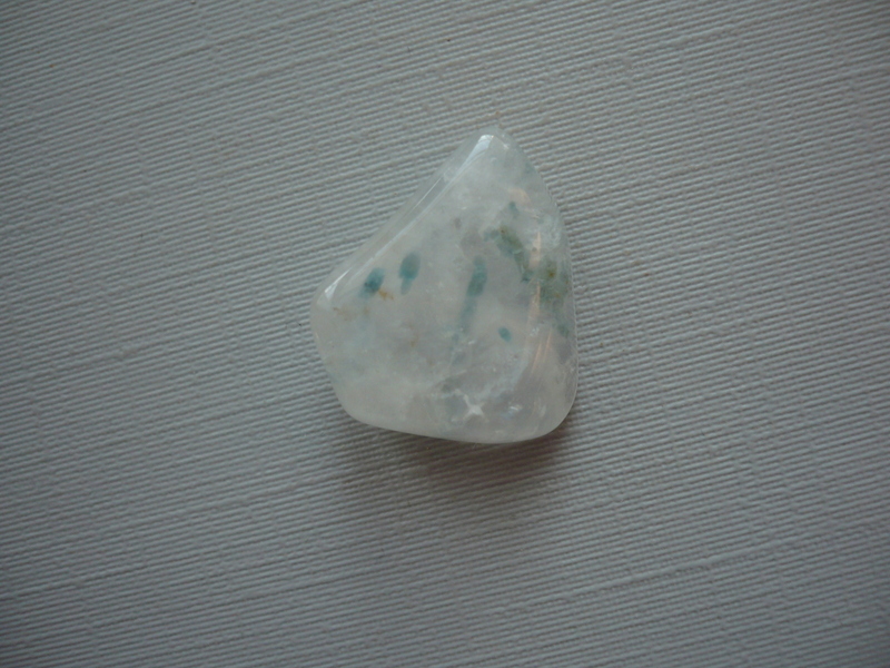 Tromlovaný kámen - aqualite (apatit v křemeni). Rozměry 18 x 16 x 6 mm. Původ Jižní Afrika.