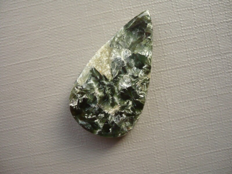 Luxusní kabošon serafinitu. Rozměry 31 x 18 x 5 mm. Původ Rusko. Vhodné pro cínování, obšívání... Ze spodní strany je plochý.