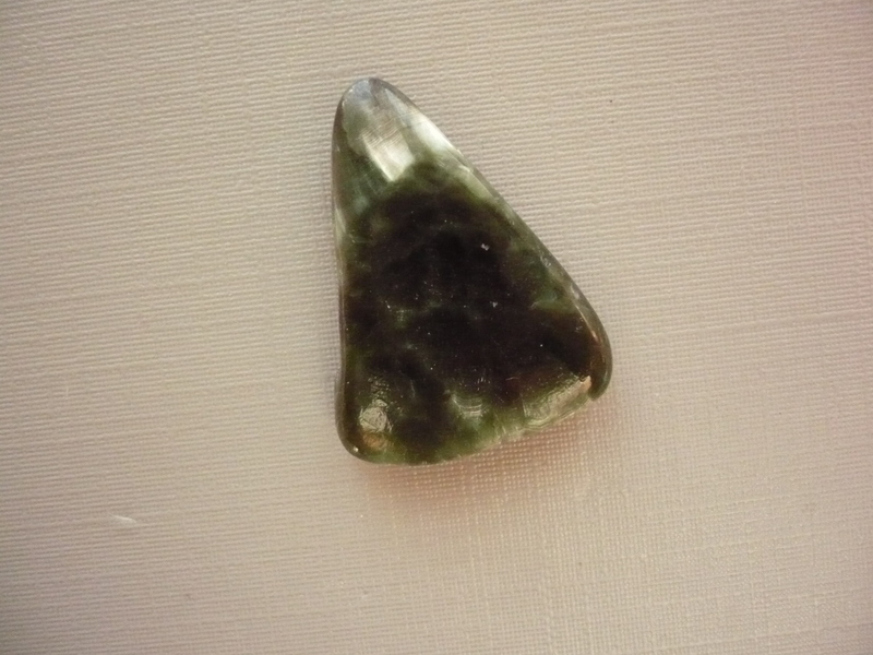 Tromlovaný kámen - serafinit. Rozměry 27 x 20 x 5 mm. Původ Rusko. Také se mu říká "andělská křídla".