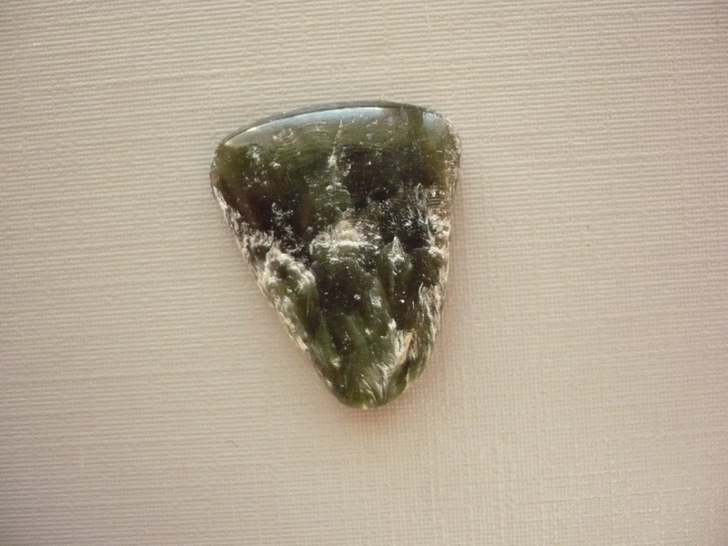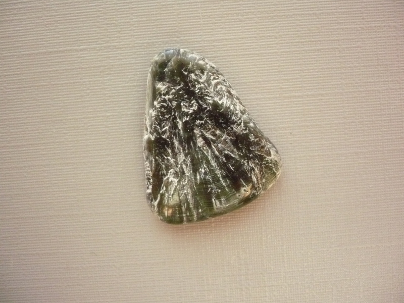 Tromlovaný kámen - serafinit. Rozměry 23 x 19 x 4 mm. Původ Rusko. Také se mu říká "andělská křídla".