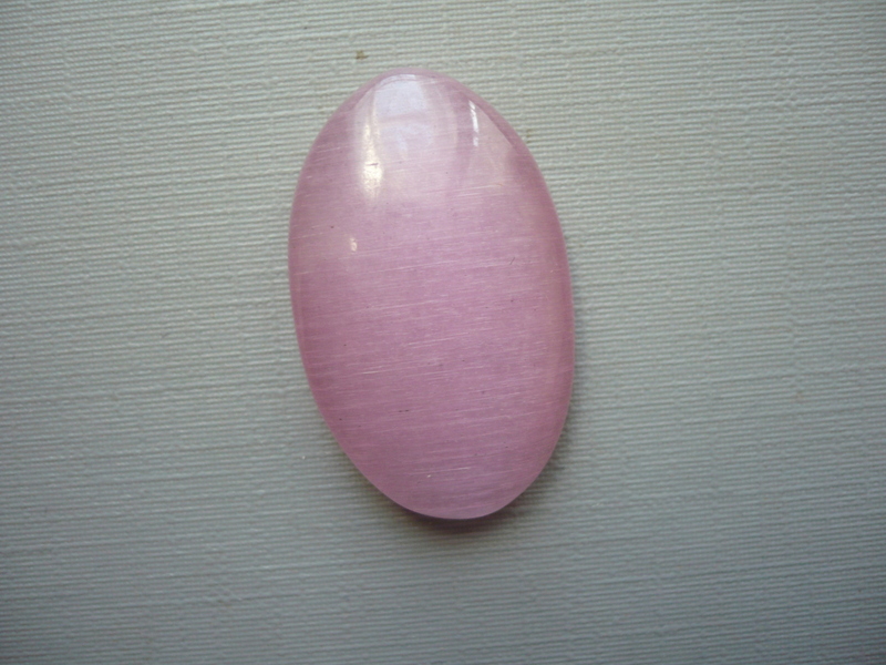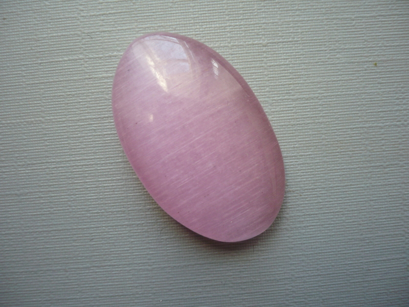 Kabošon - kočičí oko (ulexit). Rozměr 30 x 19 x 6 mm. Tento kabošon je vlastně sklo, ale velmi efektní. Uvnitř jsou paralelně uspořádané šestiboké kanálky optických vláken, v růžové variantě je velmi něžný.