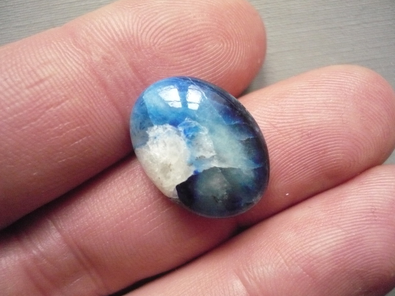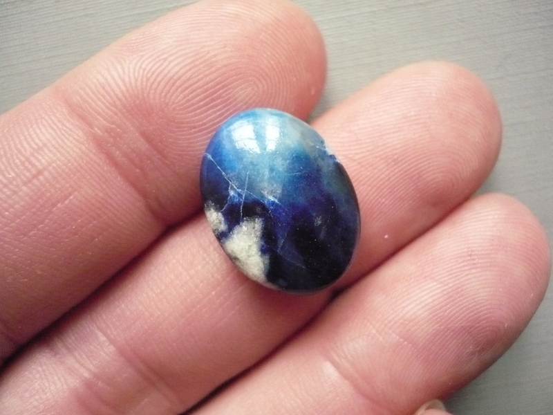 Tromlovaný kámen - afghanit. Rozměry 19 x 14 x 7 mm. Afghanit je druh sodalitu, který změnou barvy reaguje na UV světlo. Původ Afganistán.