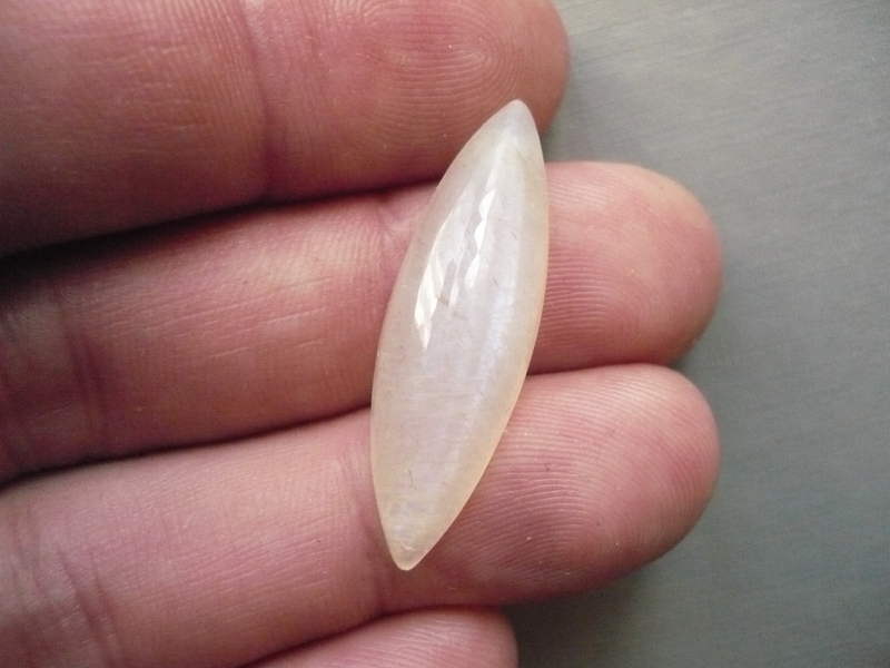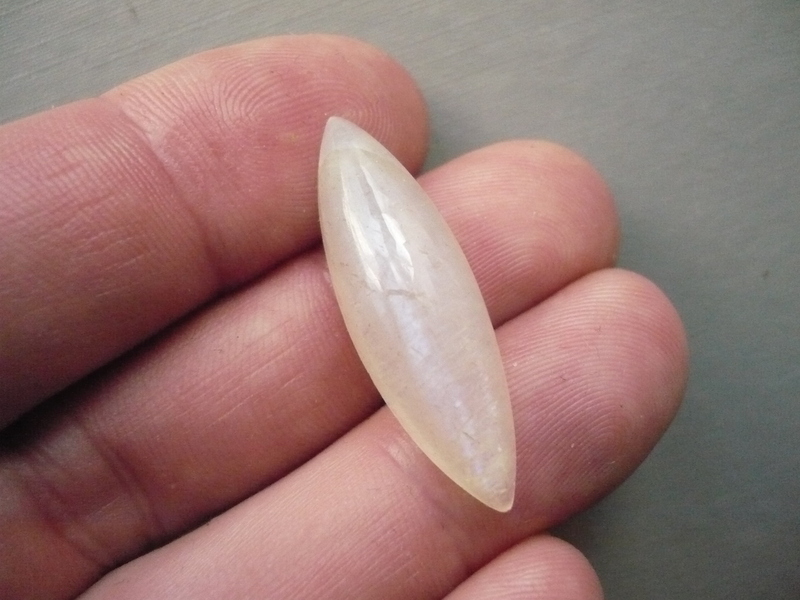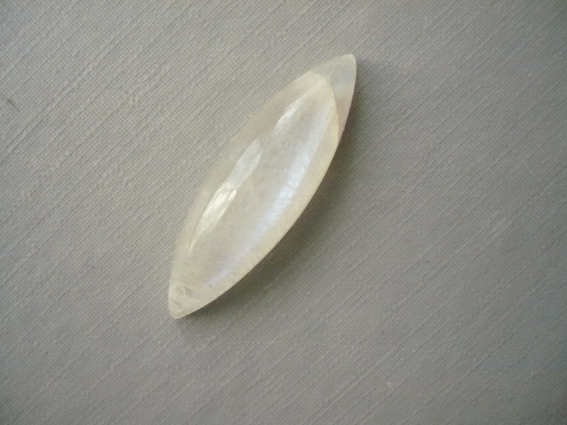 Kabošon měsíčního kamene, top kvalita. Rozměry 33 x 10 x 7 mm. Původ Indie. Vhodné pro cínování, obšívání... Ze spodní strany je plochý. Je mléčně bílý, poloprůhledný s výraznou modrou adularescencí. Jsou výběrové a moc pěkné.