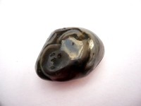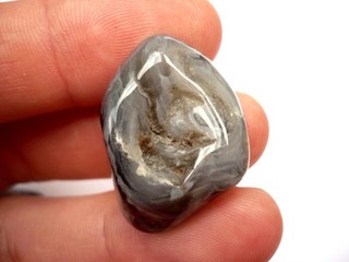 Půl geoda peříčkového achátu. Rozměry 29 x 22 x 14 mm. Jsou duté, vyplněné krystaly křišťálu, ametystu a gótitu. Také se nazývají ořechové geody. Jsou broušené a leštěné i zvenčí.