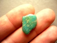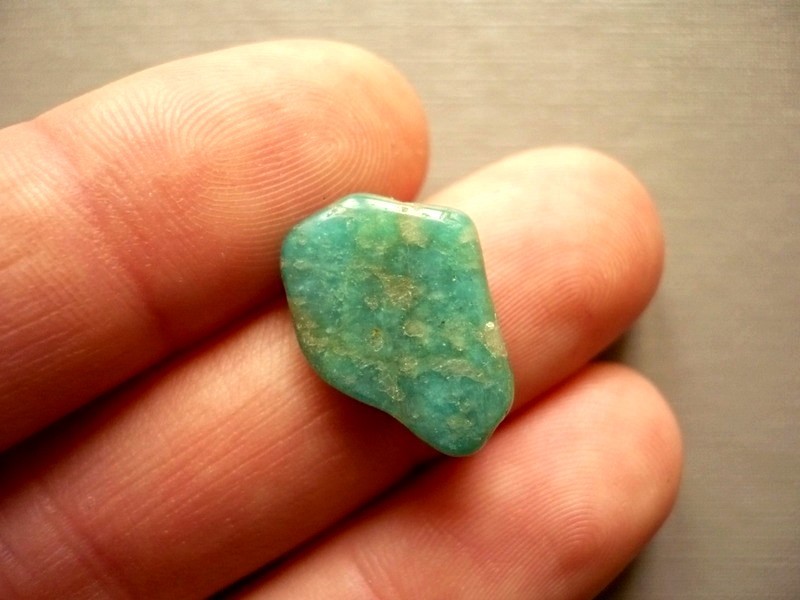 Tromlovaný kámen - amazonit. Rozměry 20 x 14 x 5 mm. Naleziště Namíbie. Barva smaragdově zelená, název dostal podle řeky Amazonky, kde jsou naleziště.