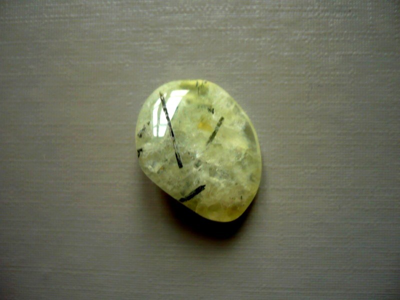 Tromlovaný kámen - prehnit s epidotem. Rozměry 20 x 16 x 7 mm. Původ Čína.