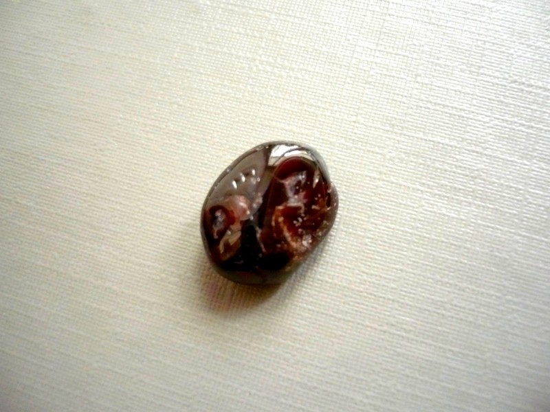 Rodolit - druh granátu, tromlovaný kámen broušený, leštěný. Rozměry 13 x 11 x 6 mm. Původ Tanzánie.