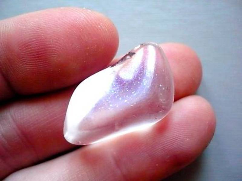 Tromlovaný kámen - křišťál aqua-aura. Rozměry 29 x 27 x 12 mm. Tromlované kameny křišťálu jsou vakuově pokoveny tenkou vrstvou titanu (není jedovatý), který způsobuje duhové zabarvení.