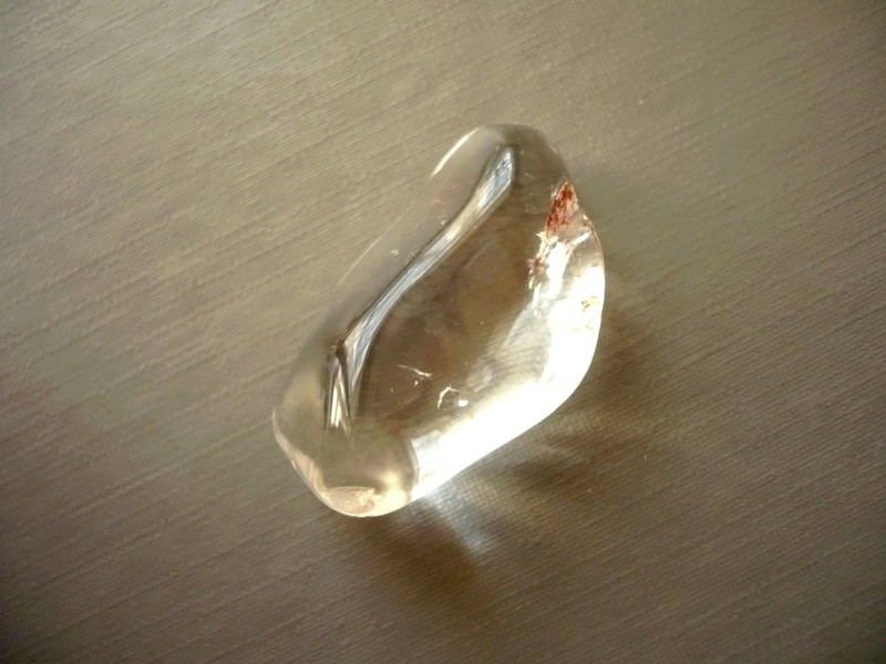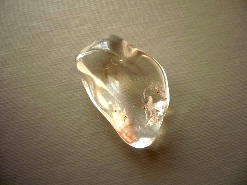 Tromlovaný kámen - křišťál fantom. Rozměry 29 x 18 x 11 mm. Obsahuje inkluze hematitu, chloridu, chromu a různé fantomy.