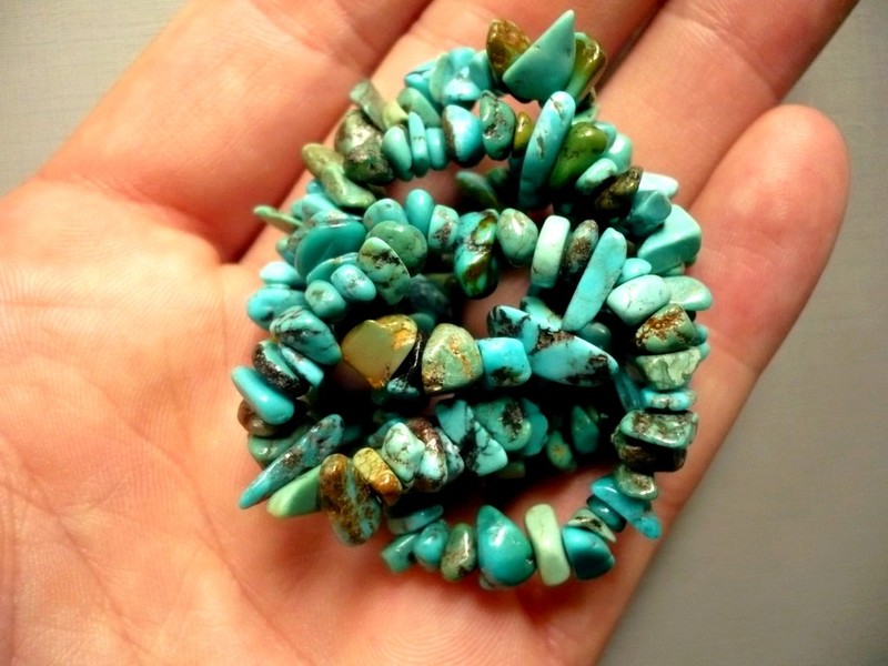 Minerální zlomky - tyrkys - v délce 20 cm, navlečeno na gumičce. Každý zlomek má svou originální kresbu.