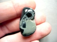Tromlovaný kámen - obsidián pavoučí. Rozměry 30 x 16 x 15 mm. Původ Mexiko. Tento má přírodní dírky.