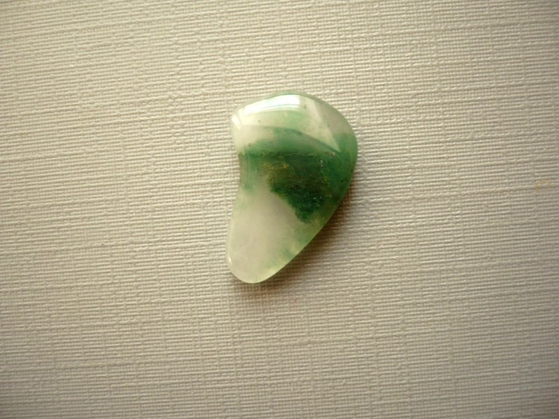 Tromlovaný kámen - chalcedon zelený (mtorolit). Rozměry 19 x 13 x 4 mm. Naleziště Zimbabwe. Chalcedon - povzbuzuje optimismus a dobou vůli, stimuluje schopnost učení. Zahání strach, smutek a deprese.