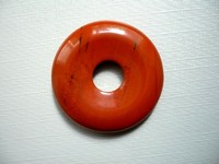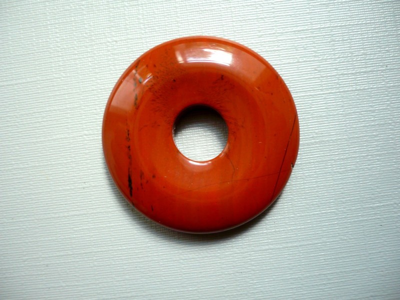 Jaspis červený - opracovaný donut vhodný k další tvorbě i jen k zavěšení. Průměr 30 mm, výška 5 mm. Každý má originální kresbu, kupujete vyfocený kus. V nabídce také závěsy na tyto donuty - jednoduché a spirálové.