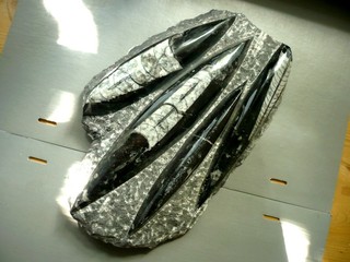 Krásný sbírkový kus zkamenělin orthocerasů v matečné sedimentární hornině. Rozměr desky 22 x 15 x 6 cm. Orthoceras je vyhynulý hlavonožec, který žil před 350-400 miliony let v mělkých mořích na území dnešního Maroka (lokalita Erfoud). Živočich žil v podlouhlé kónicky tvarované schránce. Zkamenělé schránky živočicha jsou uchovány v černém vápenci, který kopíruje podlouhlý tvar orthocerase.