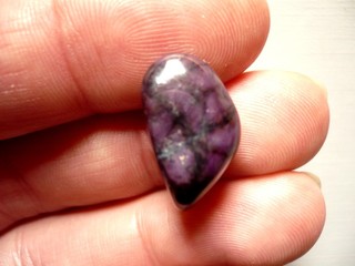 Tromlovaný kámen - sugilit (luvulit). Rozměry 20 x 12 x 11 mm. Původ JAR. Sugilit - byl objeven v jihozápadním Japonsku v roce 1944 profesorem Ken-ichi Sugi, po kterém je pojmenován. V roce 1979 bylo náhodně objeveno velké množství sugilitu drahokamové kvality v manganových dolech v okolí Kurumanu v Jižní Africe, odkud jsouni tyto tromláčky. Sugilit je oblíben zejména pro svoji krásnou fialovou nebo purpurovou barvu a ceněný je pro svoji unikátnost a omezené zdroje.