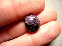 Tromlovaný kámen - sugilit (luvulit). Rozměry 14 x 11 x 9 mm. Původ JAR. Sugilit - byl objeven v jihozápadním Japonsku v roce 1944 profesorem Ken-ichi Sugi, po kterém je pojmenován. V roce 1979 bylo náhodně objeveno velké množství sugilitu drahokamové kvality v manganových dolech v okolí Kurumanu v Jižní Africe, odkud jsouni tyto tromláčky. Sugilit je oblíben zejména pro svoji krásnou fialovou nebo purpurovou barvu a ceněný je pro svoji unikátnost a omezené zdroje.