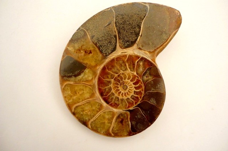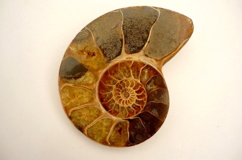 Amonit fosilní (Cleoniceras madagascariense), rozměry 11 x 8,5 x 2,4 cm. Krásný sbírkový kus, výběrový, je leštěný. Naleziště Madagaskar. Amonit - je vlastně zkamenělá schránka živočicha, připomíná beraní rohy. Amonitová schránka je uvnitř rozdělena přepážkami na menší komory, do kterých amonit vylučoval plyn. Tento plyn byl důležitý proto, aby se schránka vznášela ve vodě. Tím jak amonit rostl, tím se také zvětšovaly jednotlivé komory na otevřeném konci. Amonity však vysycháním starověkých moří postupně vymíraly a jejich schránky byly pohlceny v metamorfovaných kamenných masách.