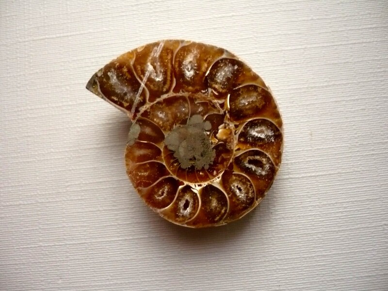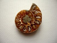 Fosilní amonit - půlka. Vhodné pro sběratele, pro obšívání, cínování... Svrchu leštěný. Rozměry 34 x 27 x 8 mm. Kupujete vyfocený kousek. Původ Madagaskar.
