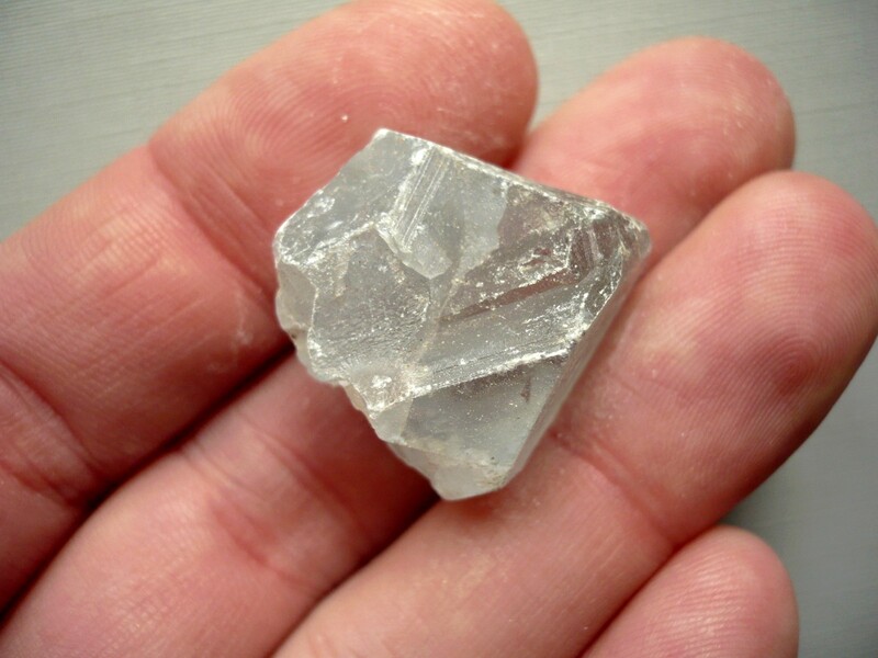 Krystal - celestýn. Původ Madagaskar. Rozměry 25 x 23 x 15 mm. Tento minerál se velmi špatně opracovává a je velmi vzácný. Má modrošedou kouřovou barvu.