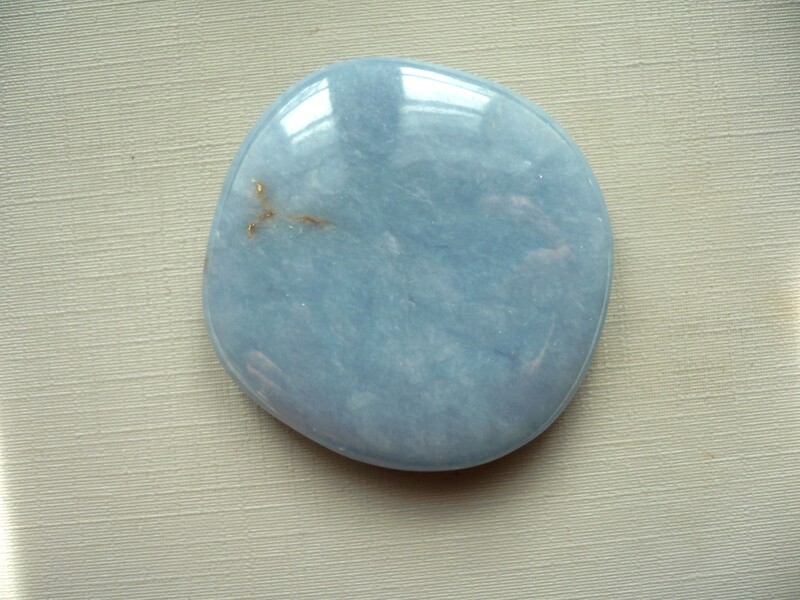 Tromlovaná placka - angelit. Rozměry 45 x 45 x 10 mm. Kupujete vyfocený kousek. Leštěné. Vhodné pro cínování, obšívání.. V nabídce také králky angelitu.