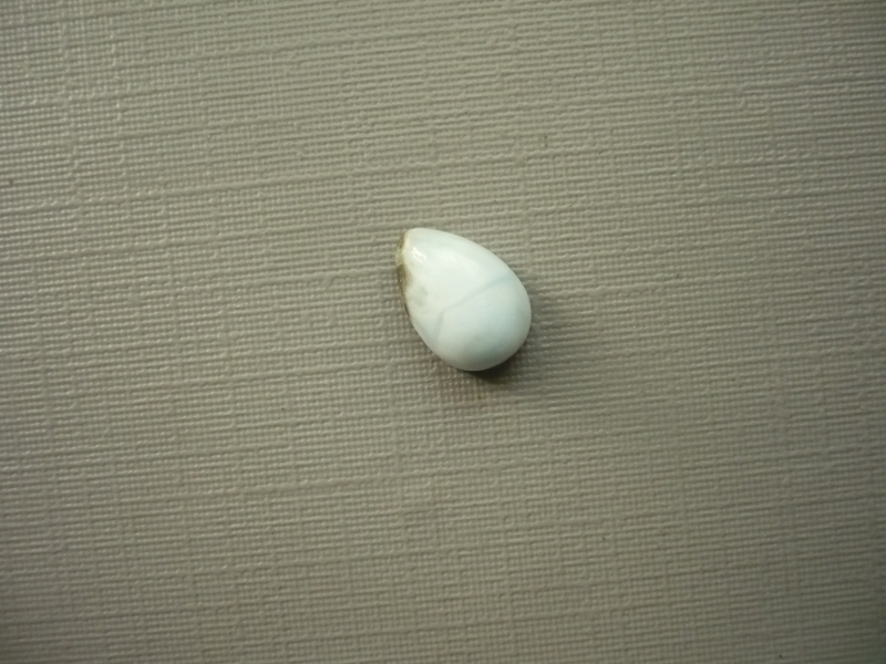 Kabošon - larimar. Rozměry 9 x 6 x 3 mm. Naleziště Dominikánská republika. Patří do skupiny pektolitů, mají krásné modré zbarvení připomínající moře. Larimar - název odvozen od slova "Mare" - moře a začátku jména Larissa, dcery obejvitele Mendeze.