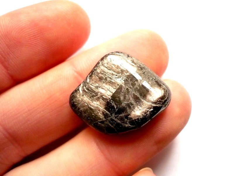 Tromlovaný kámen - hypersten. Rozměry 20 x 19 x 7 mm. Naleziště Kanada. Mají krásný fialový sametový lesk.
