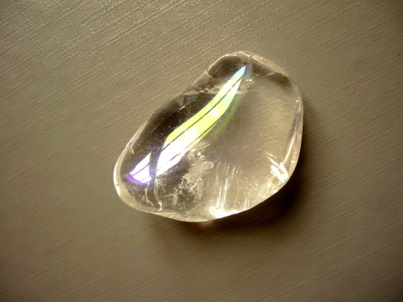Tromlovaný kámen - křišťál aqua-aura. Rozměry 33 x 23 x 13 mm. Tromlované kameny křišťálu jsou vakuově pokoveny tenkou vrstvou titanu (není jedovatý), který způsobuje duhové zabarvení.