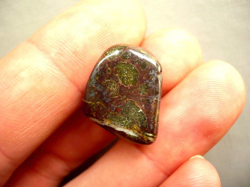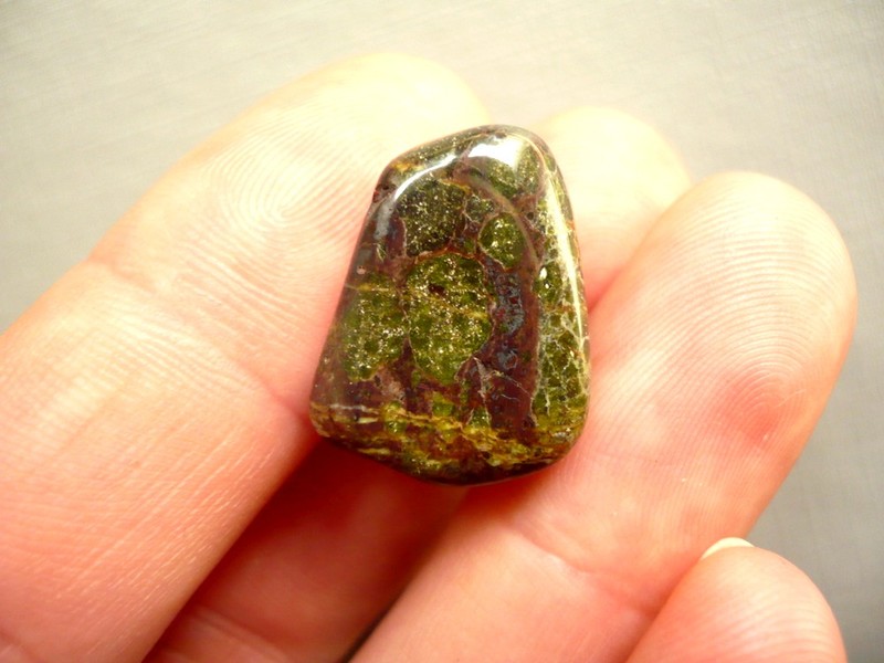 Tromlovaný kámen - epidot s červeným jaspisem. Rozměry 21 x 17 x 14 mm. Také se mu říká Dračí krev.